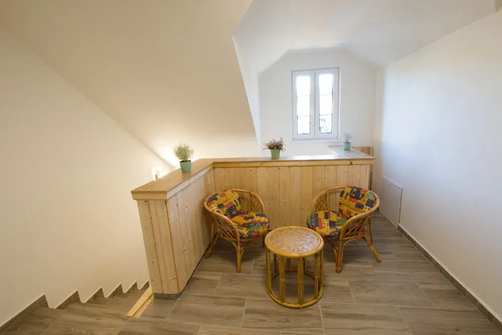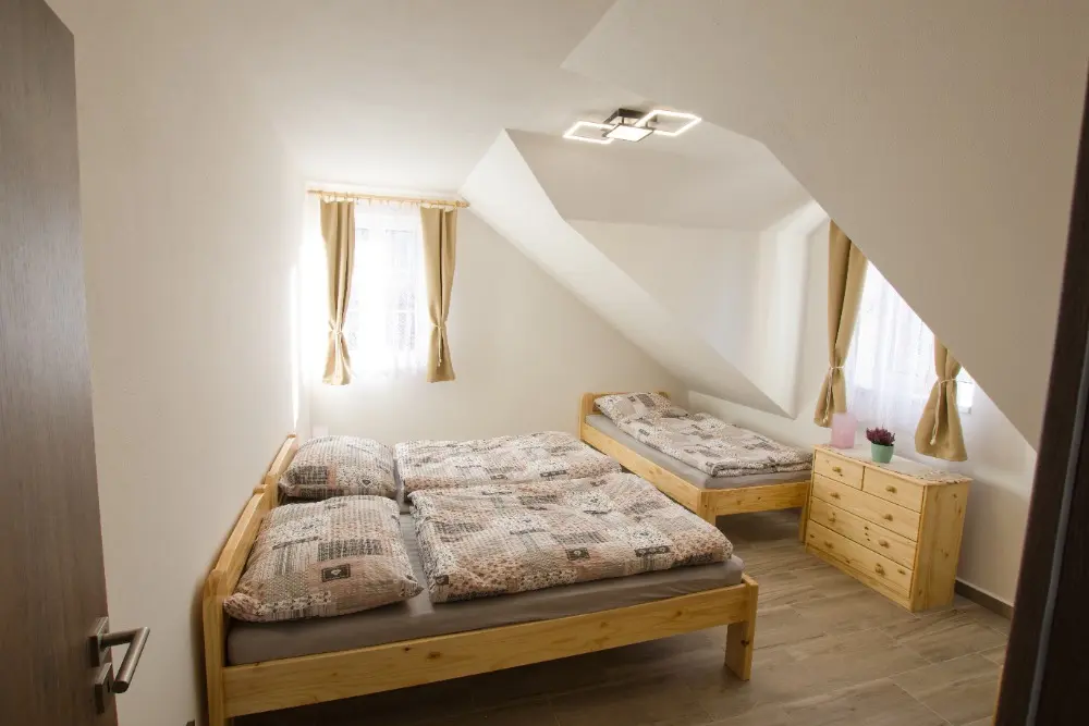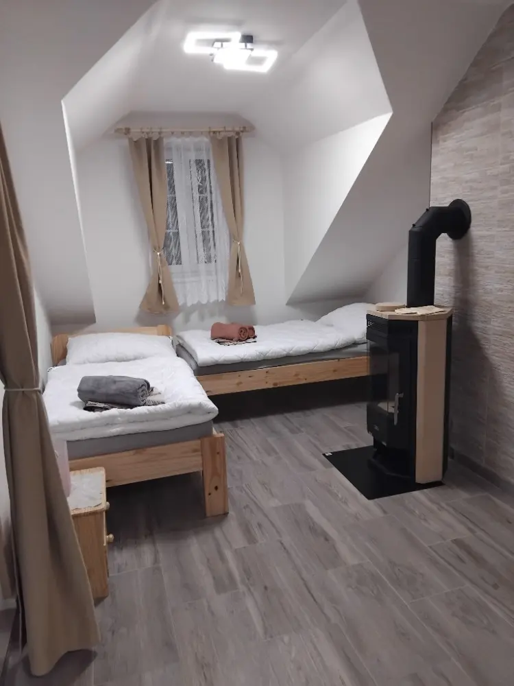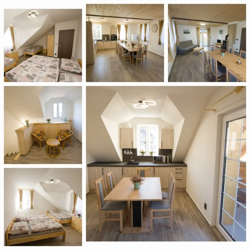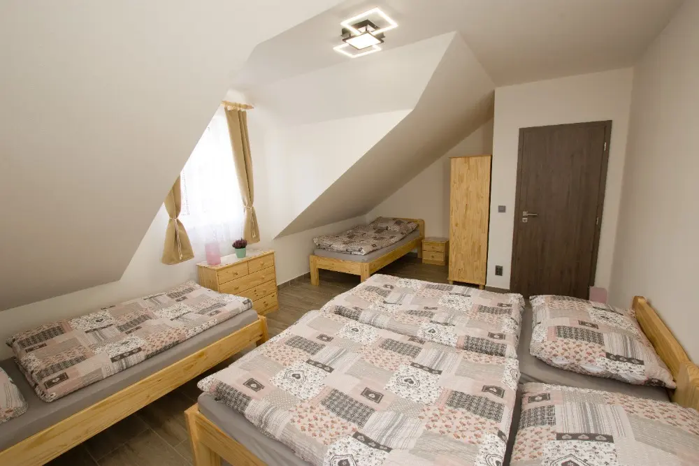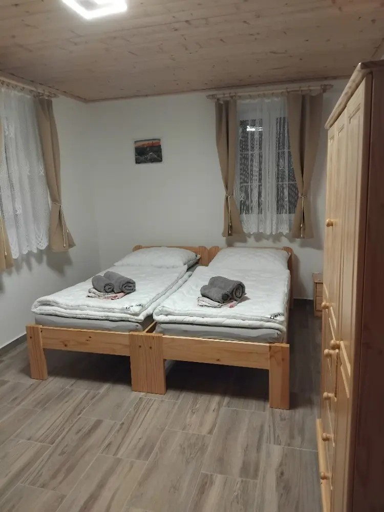 V chalupě jsou 4 oddělené ložnice a obývací místnost s přístýlkami. V horním patře jsou 2 ložnice se čtyřmi lůžky a 1 se dvěma lůžky. V dolním patře najdete 1 ložnici se čtyřmi lůžky, z toho 1 patrová, obývák se dvěma rozkládacími gauči, každý pro 1 osobu (je to lůžko a půl, má 120cm) a 2 rozkládací matrace (výška 14cm).